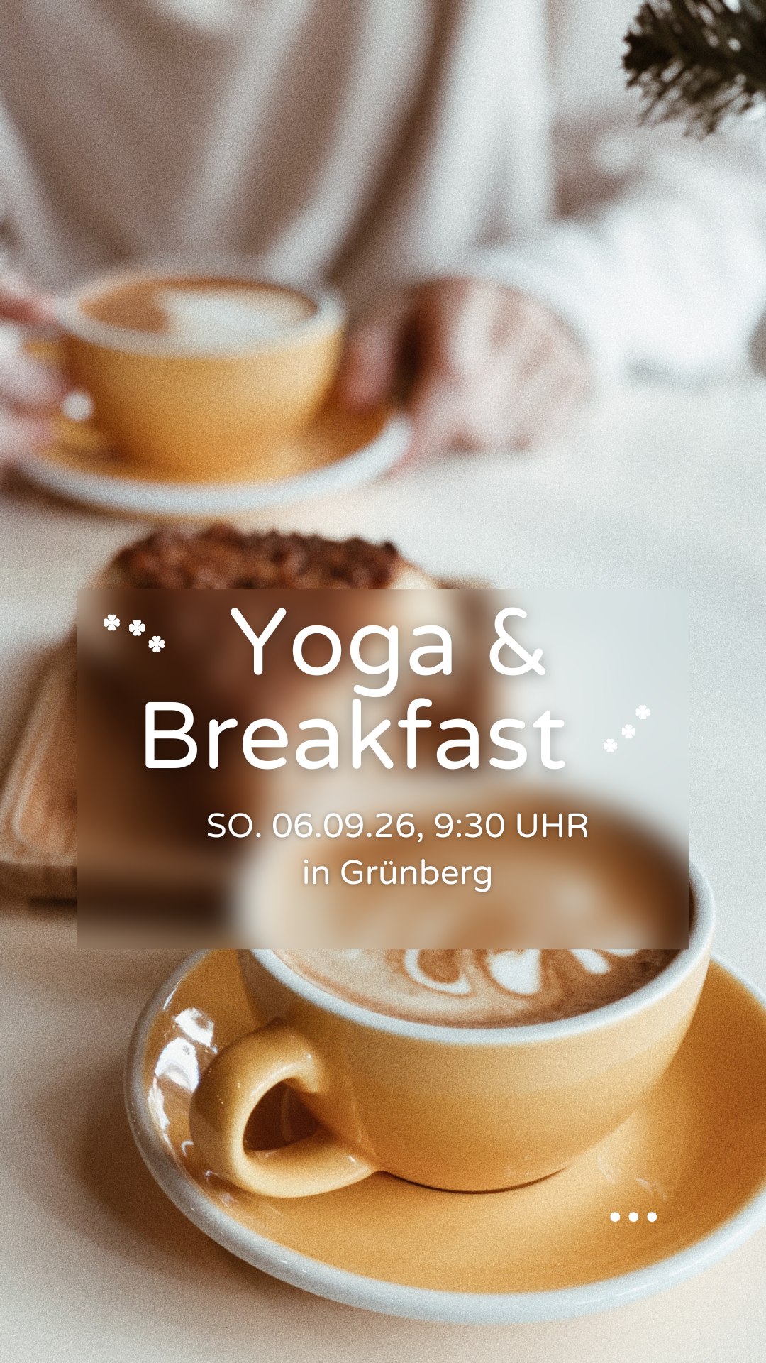 GrünbergWir starten mit einer schöner Yogaeinheit im Barfüßerkloster in Grünberg (mega tolle Atmosphäre!) und spazieren anschließend 100m weiter ins Märchencafe, um uns gemeinsam ein ausgiebiges Sonntags-Frühstück zu gönnen mit leckeren Brötchen, frische Smoothies und vielem mehr. Besonderes: Auf Allergien und Unverträglichkeiten kann selbstverständlich Rücksicht genommen werden. Bitte sagt mir einfach bei der Anmeldung bescheid.
